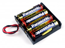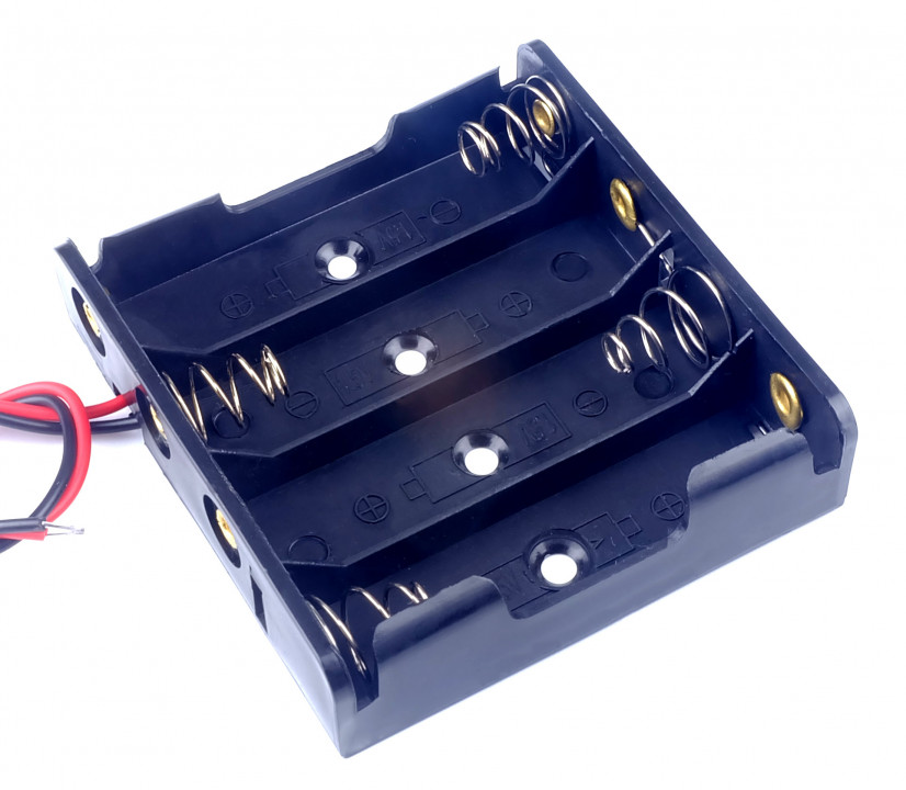 Plastic batterijhouder voor 4 AA-batterijen met 2 losse aansluitdraden. Aan de bovenkant zitten op iedere zijde 2 clipjes zodat de batterijen erg strak in de batterijhouder blijven zit, en dus niet zomaar eruit kunnen vallen. Ook de middelste batterijen zit stevig in de houder geklemd.