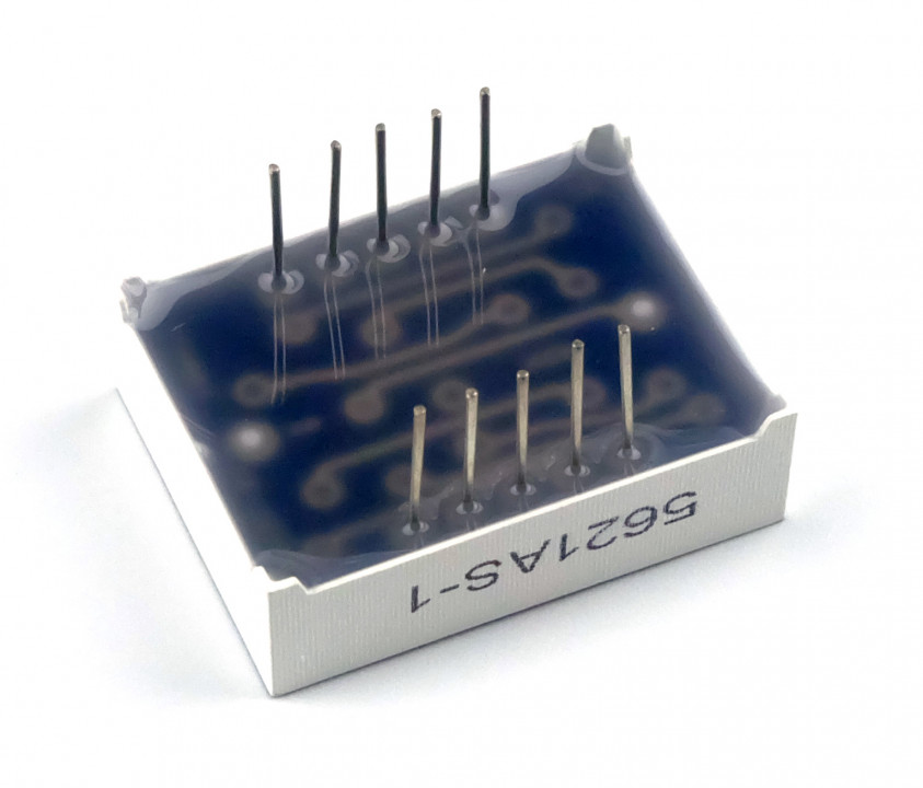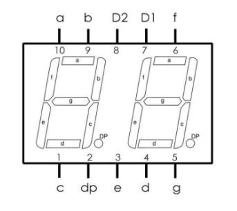 Klein 7 segment display met 2 cijfers en 2 punten. De kleur van de LEDs is rood en zijn als common cathode (cc) geschakeld. Het aansluitingsschema is hierboven als afbeelding toegevoegd.