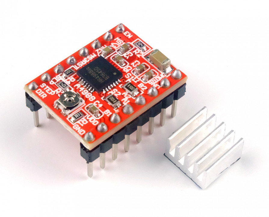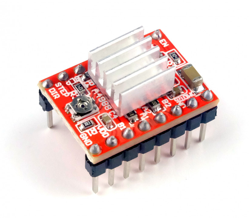De A4988 is een driver voor het aansturen van bipolaire stappenmotoren met ondersteuning voor microsteps. De driver kan ingesteld worden op 1/1, 1/2, 1/4, 1/8 en 1/16 microsteps om de stappenmotoren zo heel nauwkeurig aan te sturen.
