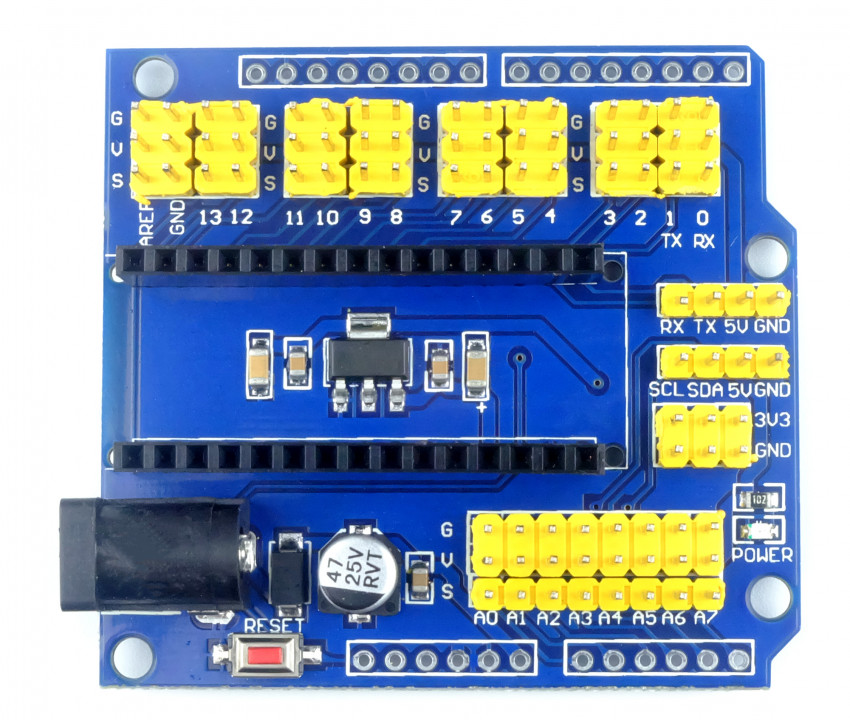 Ook is het shield voorzien van een 5V spanningsregelaar zodat je een spanning van 7V tot 18V kunt aanbieden via een DC jack.