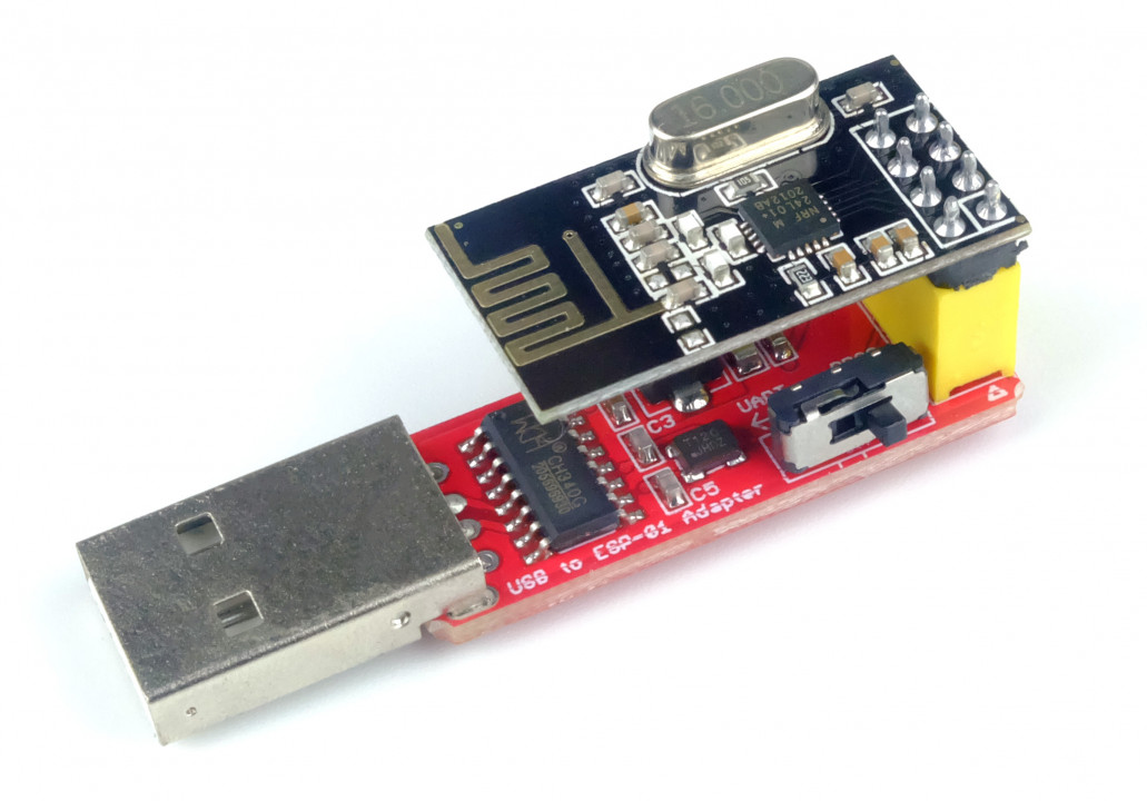 Op deze module kun je een ESP8266 (ESP-01) monteren om deze te programmeren, of om ermee via USB te communiceren. Er zit een handige schakelaar op de printplaat waarmee je de ESP8266 in programmeermodus kunt zetten.