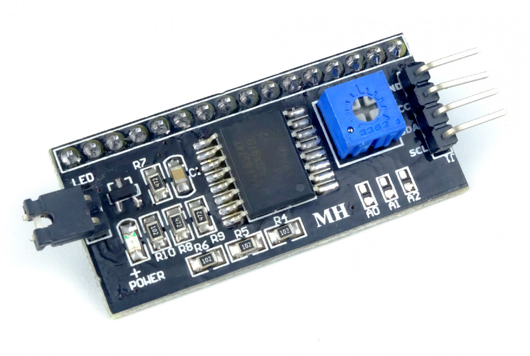 De LCM1602 module zet een serieel I2C signaal om naar een parallel signaal om het LCD display aan te sturen. Daarnaast zit er ook nog een potmeter op zodat je het contrast kunt instellen. Met slechts één LCM1602 module, 2 data signalen en een 5V voeding kun je dus zéér eenvoudig het LCD display aansturen!