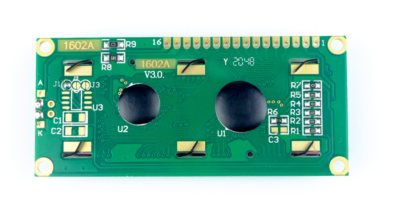 Het LCD is voorzien van de HD44780 driver, en de data moet je dus parallel inklokken via de 4- of 8-bits configuratie. Ook is het contrast in te stellen via twee pinnen. Het is aan te raden om het LCD display aan te sturen met de LCM1602 module. Je kunt dan serieel de data doorsturen (bespaart ruim 5 IO pinnen) en via een potmeter direct het contrast instellen.