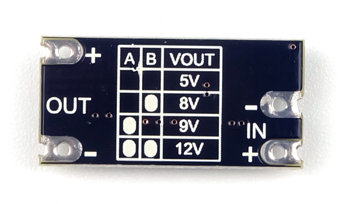 Op de bovenkant van de module zitten twee soldeerjumpers genaamd 'A' en 'B' waarmee je de uitgangsspanning kunt instellen. Aan de achterkant van de printplaat staat een tabel waarop de instellingen teruggevonden kunnen worden. Standaard zijn de soldeerjumpers 'A' en 'B' gesoldeerd, wat zorgt voor een uitgangsspanning van 12V.