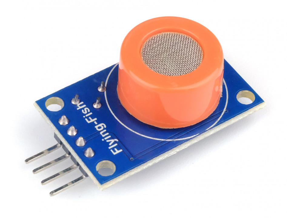 Aan de onderzijde van deze gas sensor module zitten de aansluitingen voor de voeding (5V), een digitale uitgang en een analoge uitgang. Daarnaast zit er nog een potmeter op om het drempelpunt van de digitale uitgang in te stellen. De digitale uitgang is hoog actief als deze een bepaalde grenswaarde heeft bereikt.