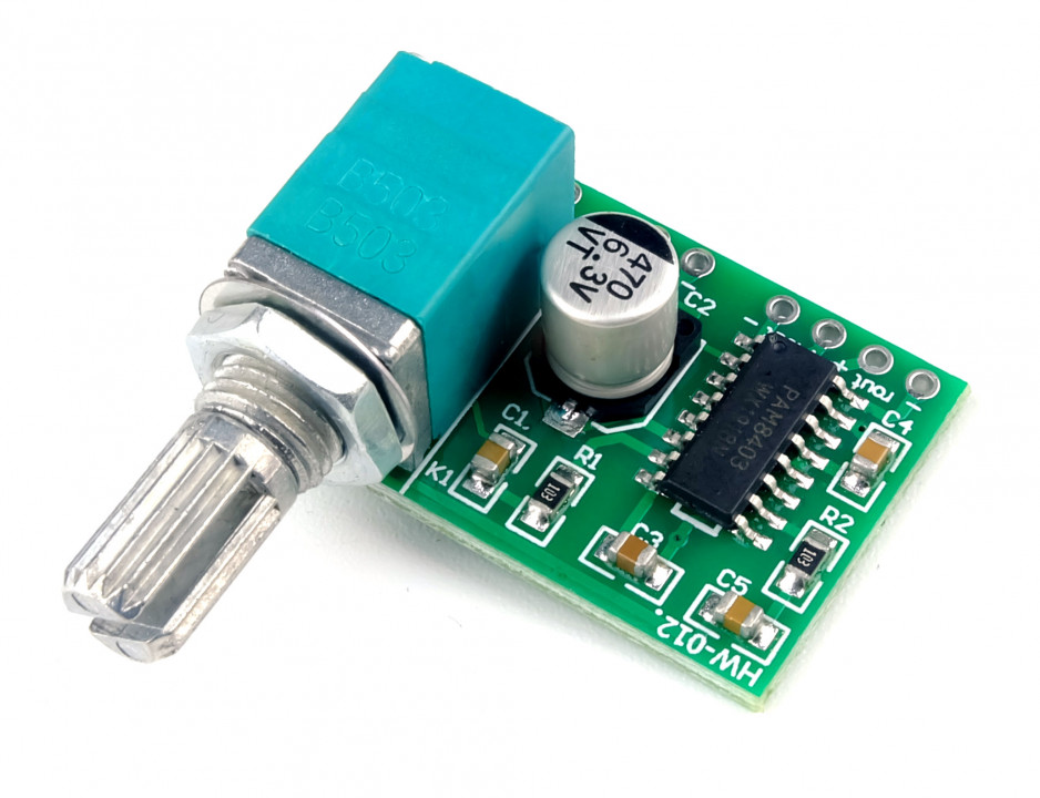 Krachtige stereoversterker waarmee je een audiosignaal kunt versterken tot 2x 3 Watt. Deze audioversterker is gebaseerd op een Klasse D versterker en is daardoor erg efficiënt (> 90%). Op deze module zit ook een potmeter waarmee het volume staploos ingesteld kan worden. Als je de potmeter helemaal naar links draait kun je de versterker uitschakelen.